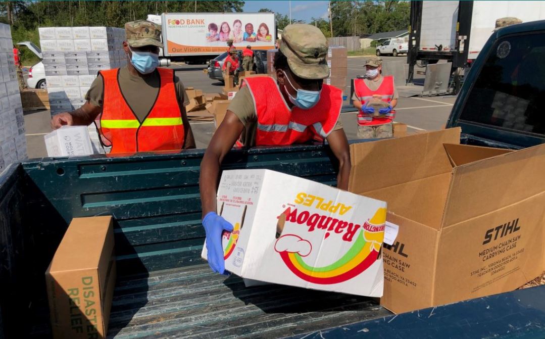 Top image caption: Louisiana National Guard helping at a Food Bank drive-through distribution area in Ruston in Lincoln parish. Credit: Sarah Hoffman